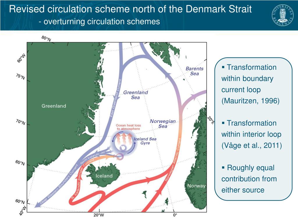 Revised circulation scheme north of the Denmark Strait - overturning circulation schemes • Transformation within boundary current loop (Mauritzen, 1996) • Transformation within interior loop (Våge et al., 2011) • Roughly equal contribution from either source