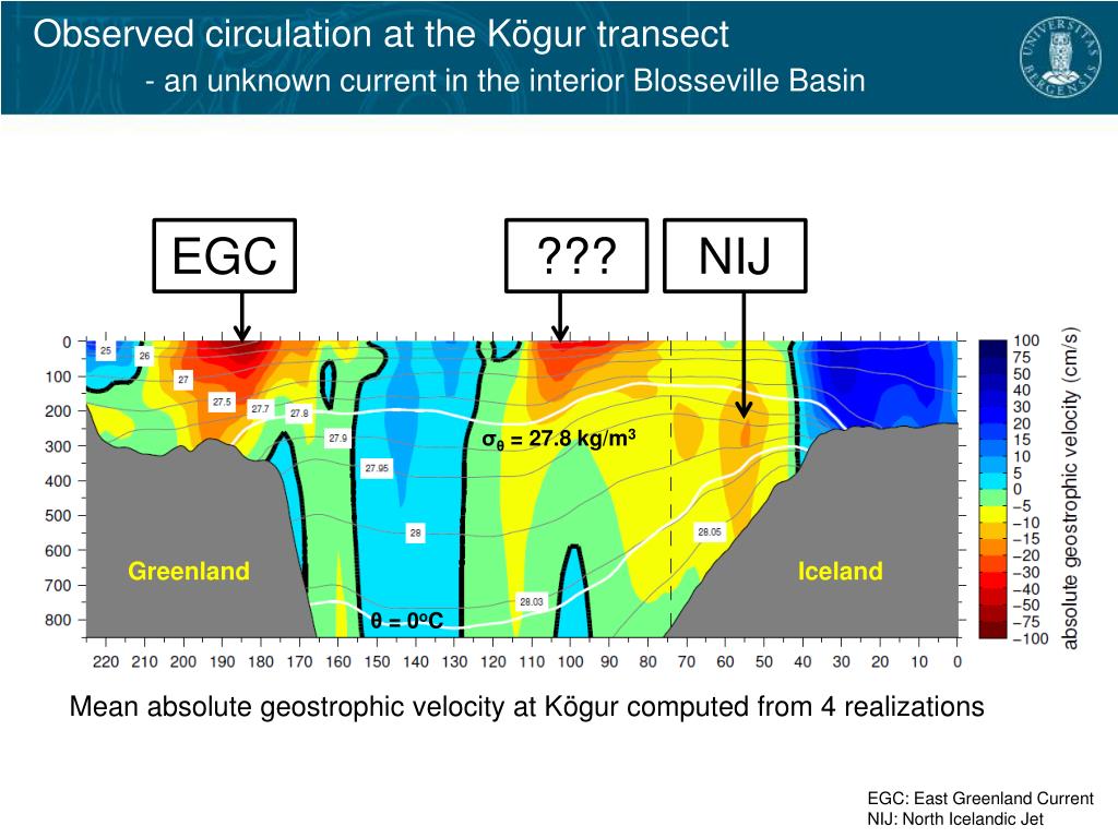 Observed circulation at the Kögur transect - an unknown current in the interior Blosseville Basin EGC ??? NIJ σθ = 27.8 kg/m3 Greenland Iceland θ = 0oC Mean absolute geostrophic velocity at Kögur computed from 4 realizations EGC: East Greenland Current NIJ: North Icelandic Jet