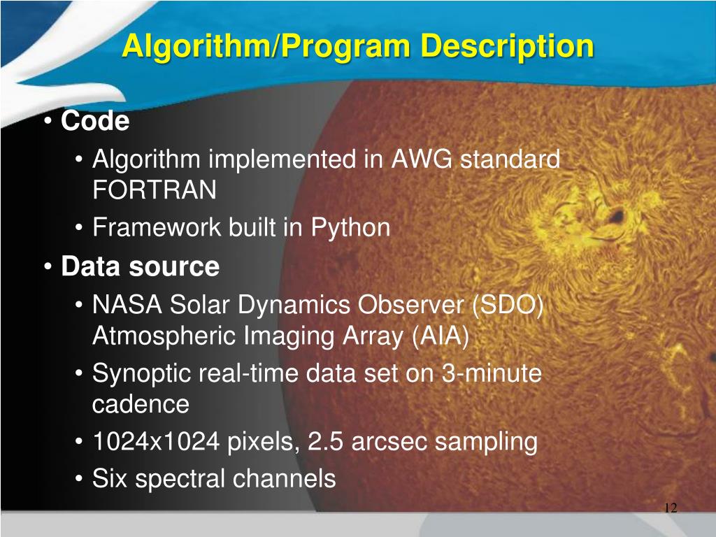 Code Algorithm implemented in AWG standard FORTRAN Framework built in Python Data source NASA Solar Dynamics Observer (SDO) Atmospheric Imaging Array (AIA) Synoptic real-time data set on 3-minute cadence 1024x1024 pixels, 2.5 arcsec sampling Six spectral channels Algorithm/Program Description