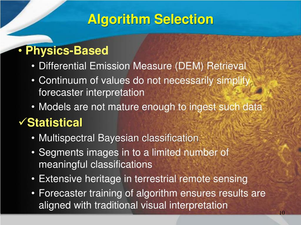 Physics-Based Differential Emission Measure (DEM) Retrieval Continuum of values do not necessarily simplify forecaster interpretation Models are not mature enough to ingest such data Statistical Multispectral Bayesian classification Segments images in to a limited number of meaningful classifications Extensive heritage in terrestrial remote sensing Forecaster training of algorithm ensures results are aligned with traditional visual interpretation Algorithm Selection