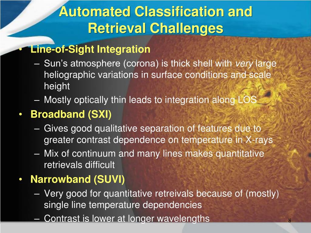 Automated Classification and Retrieval Challenges • Line-of-Sight Integration • Sun’s atmosphere (corona) is thick shell with very large heliographic variations in surface conditions and scale height • Mostly optically thin leads to integration along LOS • Broadband (SXI) • Gives good qualitative separation of features due to greater contrast dependence on temperature in X-rays • Mix of continuum and many lines makes quantitative retrievals difficult • Narrowband (SUVI) • Very good for quantitative retreivals because of (mostly) single line temperature dependencies • Contrast is lower at longer wavelengths