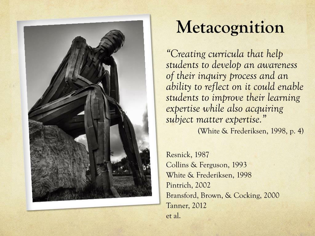 Metacognition “Creating curricula that help students to develop an awareness of their inquiry process and an ability to reflect on it could enable students to improve their learning expertise while also acquiring subject matter expertise.” (White & Frederiksen, 1998, p. 4) Resnick, 1987 Collins & Ferguson, 1993 White & Frederiksen, 1998 Pintrich, 2002 Bransford, Brown, & Cocking, 2000 Tanner, 2012 et al.