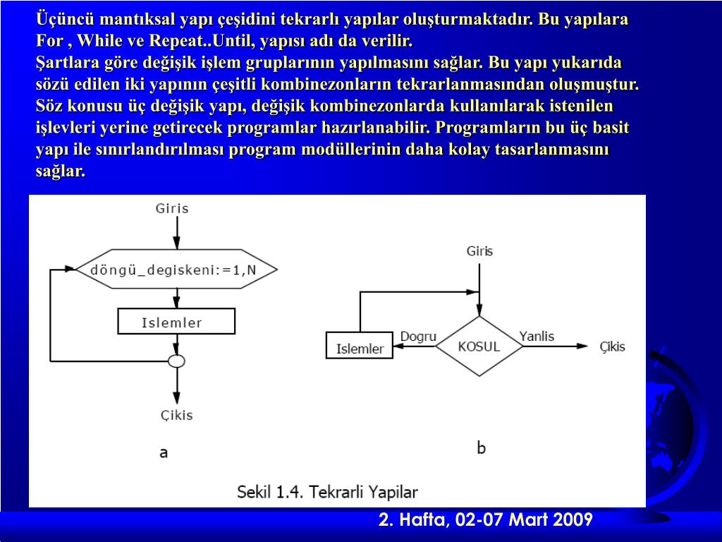 Üçüncü mantıksal yapı çeşidini tekrarlı yapılar oluşturmaktadır. Bu yapılara For , While ve Repeat..Until, yapısı adı da verilir. Şartlara göre değişik işlem gruplarının yapılmasını sağlar. Bu yapı yukarıda sözü edilen iki yapının çeşitli kombinezonların tekrarlanmasından oluşmuştur. Söz konusu üç değişik yapı, değişik kombinezonlarda kullanılarak istenilen işlevleri yerine getirecek programlar hazırlanabilir. Programların bu üç basit yapı ile sınırlandırılması program modüllerinin daha kolay tasarlanmasını sağlar. 2. Hafta, 02-07 Mart 2009