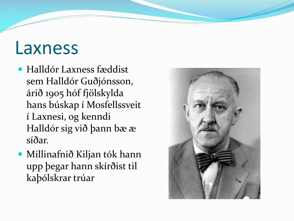 Laxness • Halldór Laxness fæddistsemHalldórGuðjónsson, árið 1905 hóffjölskyldahansbúskap í Mosfellssveit í Laxnesi, ogkenndiHalldór sig viðþannbæ æ síðar. • MillinafniðKiljantókhannuppþegarhannskírðisttilkaþólskrartrúar