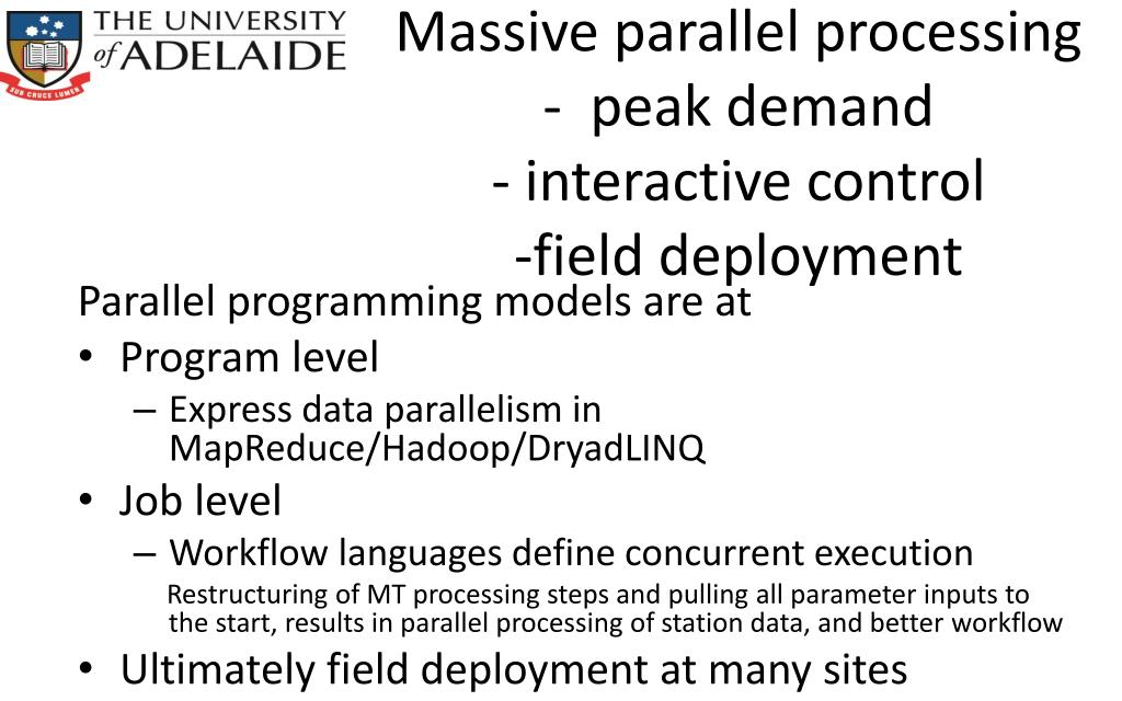 Massive parallel processing - peak demand - interactive control-field deployment Parallel programming models are at • Program level • Express data parallelism in MapReduce/Hadoop/DryadLINQ • Job level • Workflow languages define concurrent execution Restructuring of MT processing steps and pulling all parameter inputs to the start, results in parallel processing of station data, and better workflow • Ultimately field deployment at many sites
