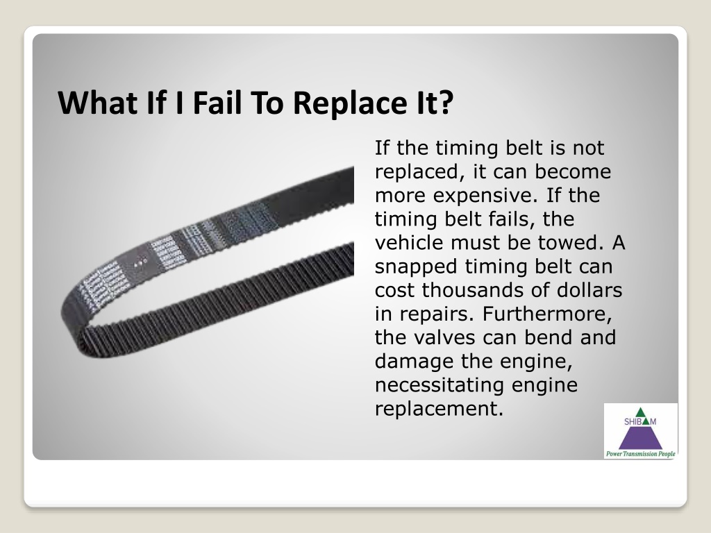 What If I Fail To Replace It? If the timing belt is not replaced, it can become more expensive. If the timing belt fails, the vehicle must be towed. A snapped timing belt can cost thousands of dollars in repairs. Furthermore, the valves can bend and damage the engine, necessitating engine replacement.