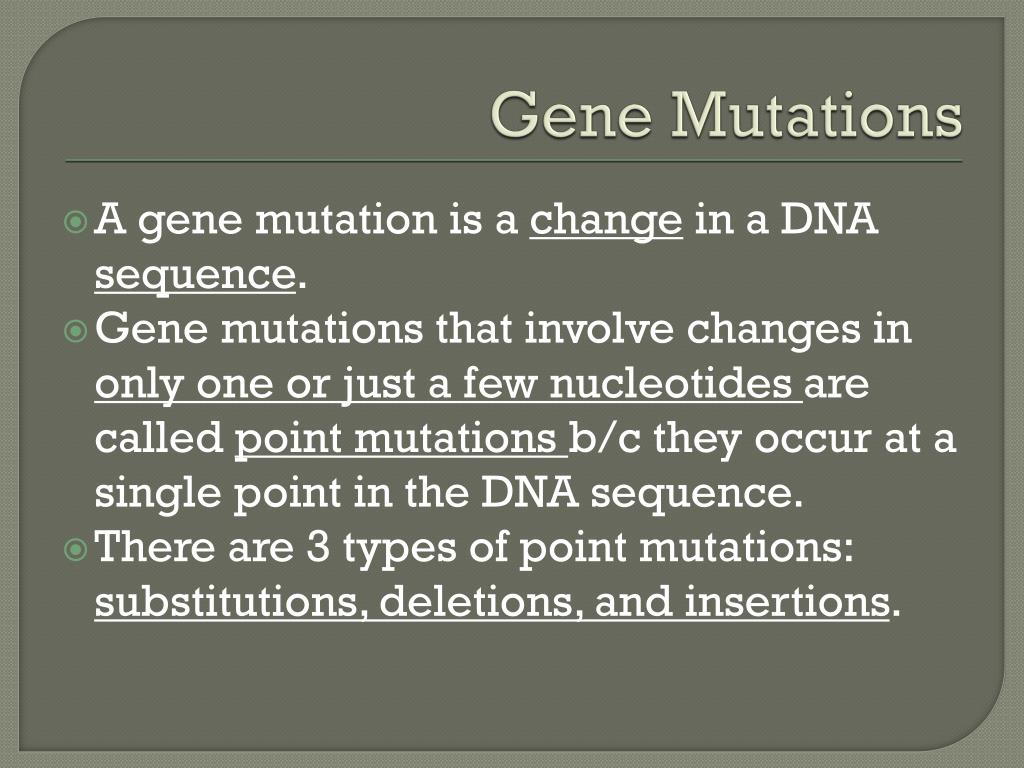 Gene Mutations A gene mutation is a change in a DNA sequence. Gene mutations that involve changes in only one or just a few nucleotides are called point mutations b/c they occur at a single point in the DNA sequence. There are 3 types of point mutations: substitutions, deletions, and insertions.