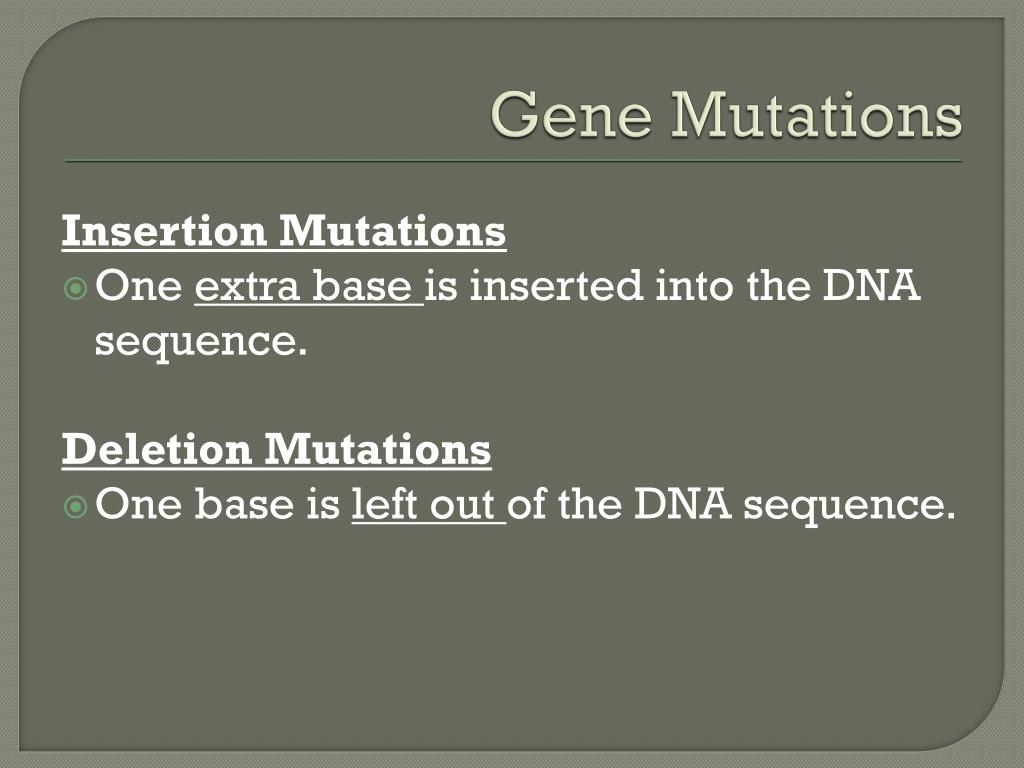Gene Mutations Insertion Mutations One extra base is inserted into the DNA sequence. Deletion Mutations One base is left out of the DNA sequence.