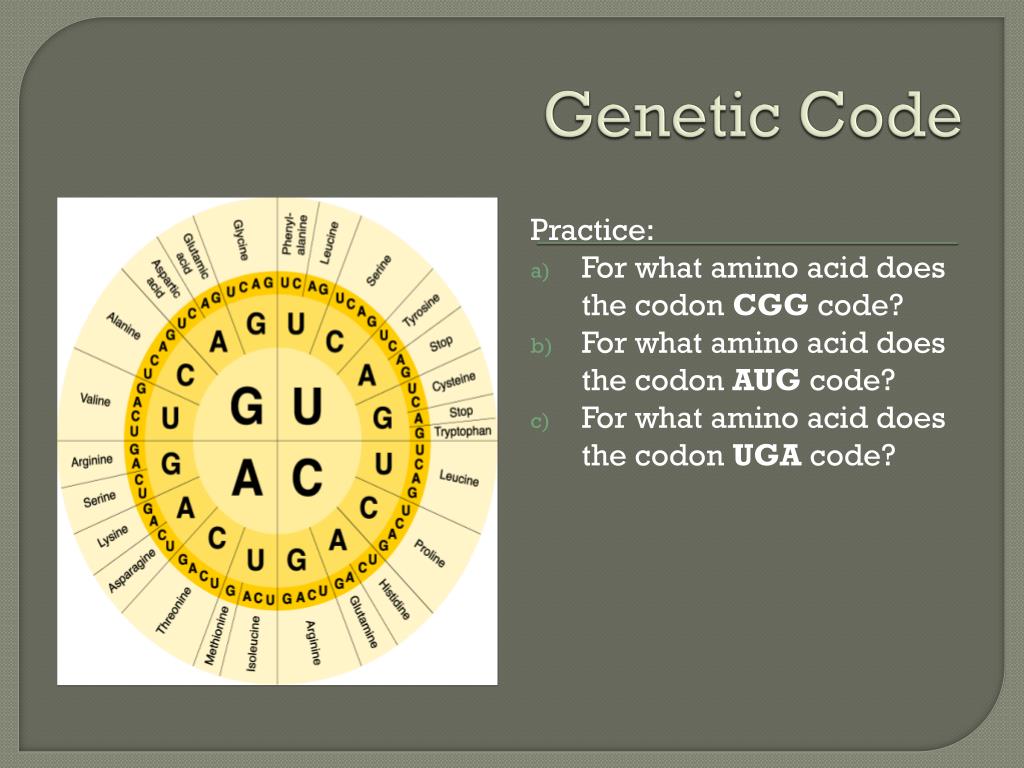 Genetic Code Practice: • For what amino acid does the codonCGG code? • For what amino acid does the codonAUG code? • For what amino acid does the codonUGA code?