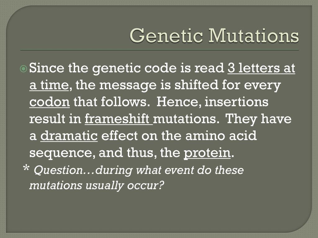 Genetic Mutations Since the genetic code is read 3 letters at a time, the message is shifted for every codon that follows. Hence, insertions result in frameshift mutations. They have a dramatic effect on the amino acid sequence, and thus, the protein. * Question…during what event do these mutations usually occur?
