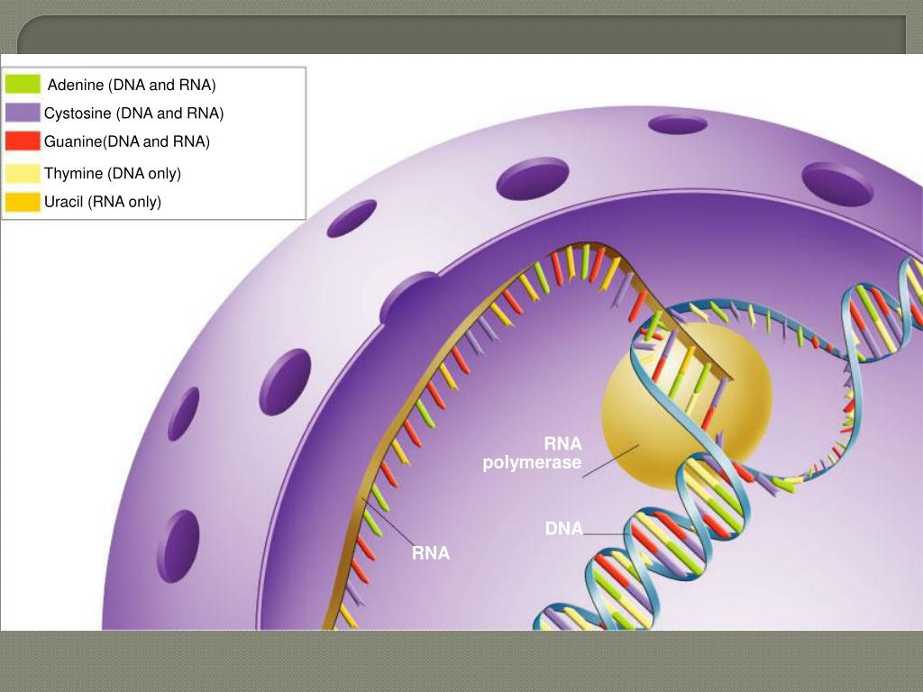 Adenine (DNA and RNA) Cystosine (DNA and RNA) Guanine(DNA and RNA) Thymine (DNA only) Uracil (RNA only) RNApolymerase DNA RNA