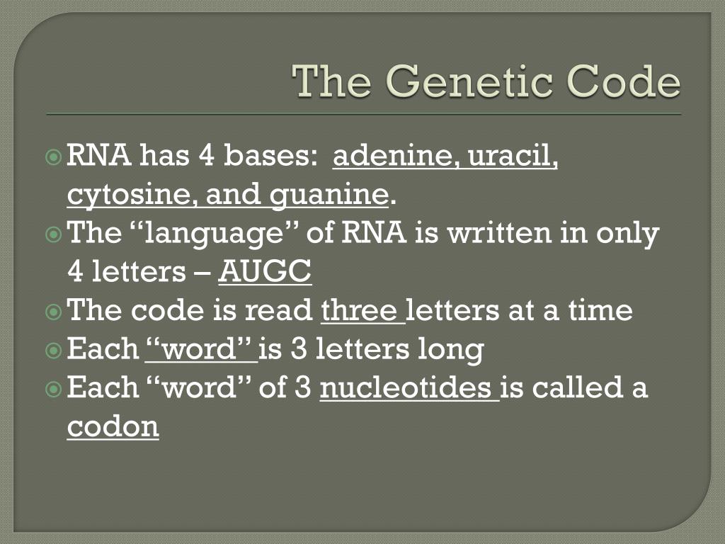 The Genetic Code RNA has 4 bases: adenine, uracil, cytosine, and guanine. The “language” of RNA is written in only 4 letters – AUGC The code is read three letters at a time Each “word” is 3 letters long Each “word” of 3 nucleotides is called a codon