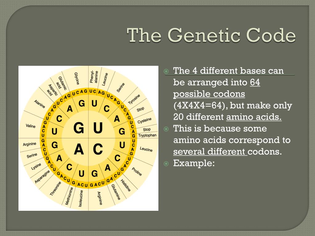 The Genetic Code • The 4 different bases can be arranged into 64 possible codons (4X4X4=64), but make only 20 different amino acids. • This is because some amino acids correspond to several different codons. • Example: