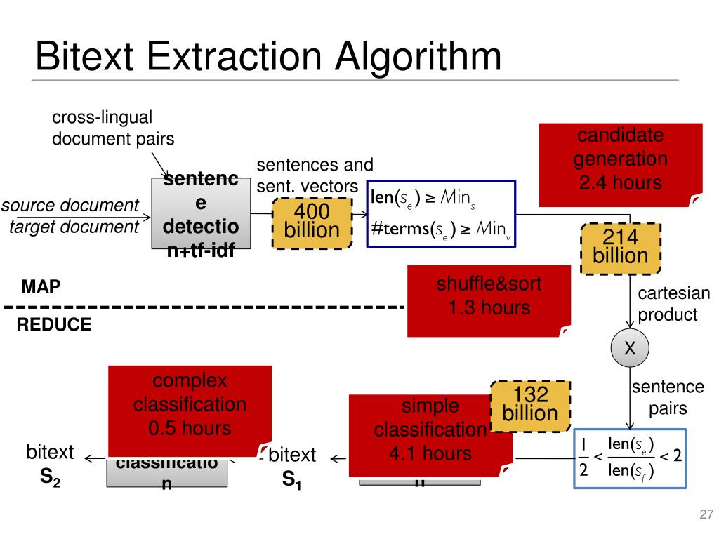 Bitext Extraction Algorithm cross-lingual document pairs candidate generation 2.4 hours sentences and sent. vectors sentence detection+tf-idf source document target document 400 billion 214 billion shuffle&sort 1.3 hours MAP cartesian product REDUCE X complex classification 0.5 hours sentence pairs 132 billion simple classification 4.1 hours simple classification bitext S2 complex classification bitextS1