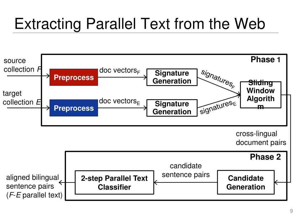 Extracting Parallel Text from the Web Phase 1 source collection F doc vectorsF Preprocess Signature Generation signaturesF Sliding Window Algorithm target collection E doc vectorsE Preprocess Signature Generation signaturesE cross-lingual document pairs Phase 2 candidate sentence pairs Candidate Generation 2-step Parallel Text Classifier aligned bilingual sentence pairs (F-E parallel text)