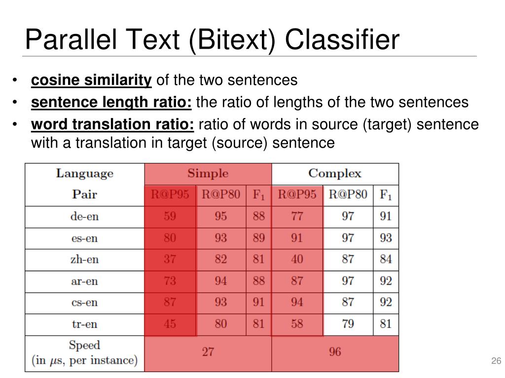 Parallel Text (Bitext) Classifier • cosine similarityof the two sentences • sentence length ratio:the ratio of lengths of the two sentences • word translation ratio:ratio of words in source (target) sentence with a translation in target (source) sentence