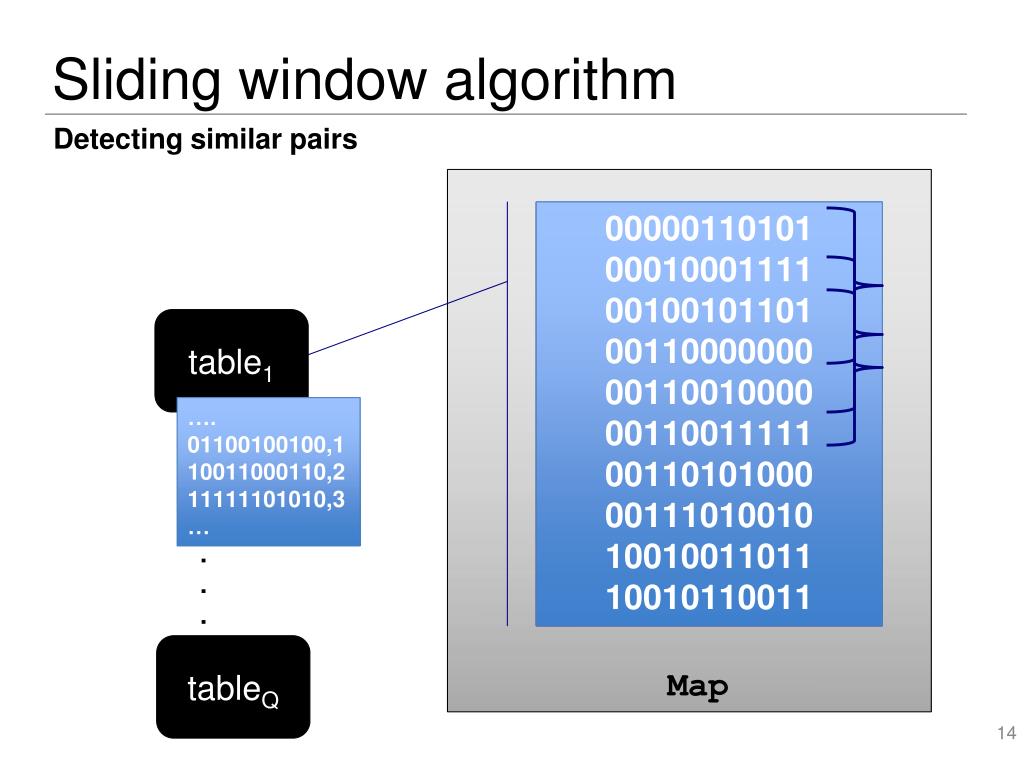 Sliding window algorithm Detecting similar pairs 00000110101 00010001111 00100101101 00110000000 00110010000 00110011111 00110101000 00111010010 10010011011 10010110011 table1 …. 01100100100,1 10011000110,2 11111101010,3 … . . . tableQ Map