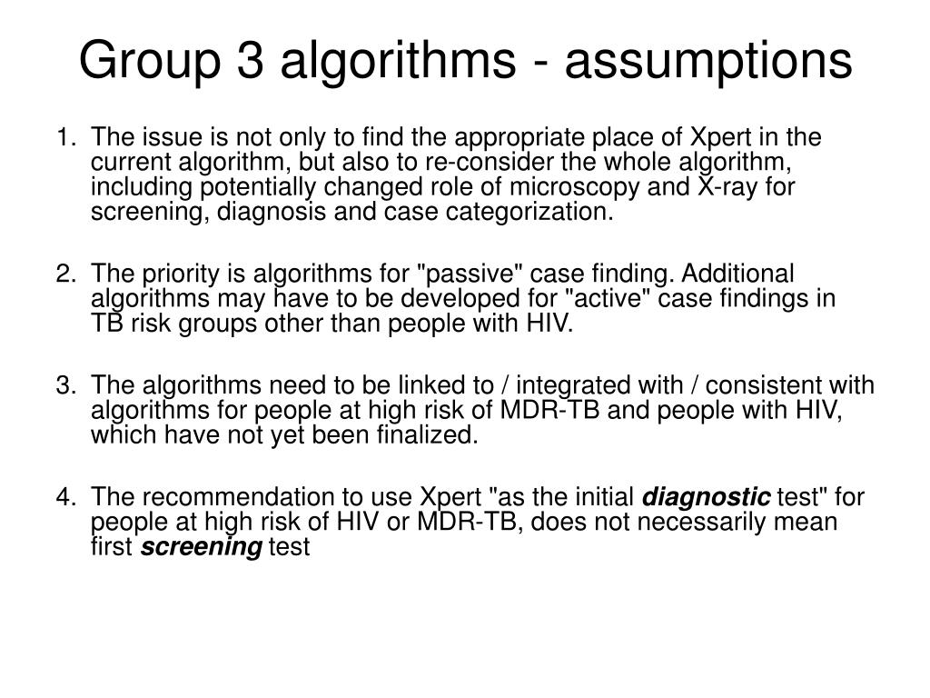 Group 3 algorithms - assumptions • The issue is not only to find the appropriate place of Xpert in the current algorithm, but also to re-consider the whole algorithm, including potentially changed role of microscopy and X-ray for screening, diagnosis and case categorization. • The priority is algorithms for "passive" case finding. Additional algorithms may have to be developed for "active" case findings in TB risk groups other than people with HIV. • The algorithms need to be linked to / integrated with / consistent with algorithms for people at high risk of MDR-TB and people with HIV, which have not yet been finalized. • The recommendation to use Xpert "as the initial diagnostic test" for people at high risk of HIV or MDR-TB, does not necessarily mean first screening test