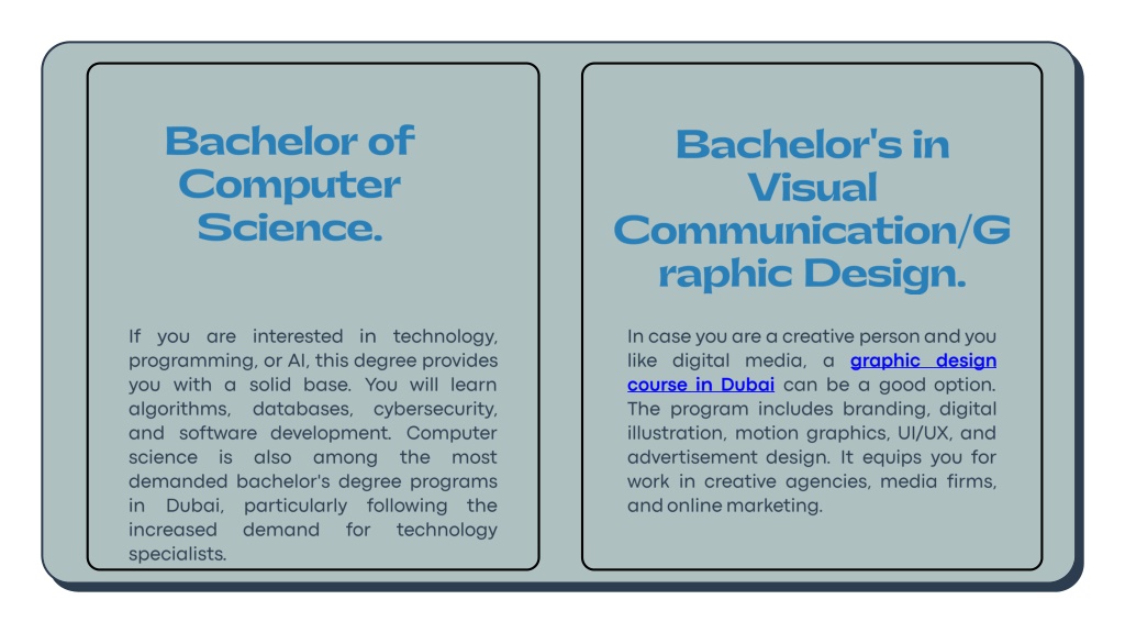 5. If you are interested in technology, programming, or AI, this degree provides you with a solid base. You will learn algorithms, databases, cybersecurity, and software development. Computer science is also among the most demanded bachelor's degree programs in Dubai, particularly following the increased demand for technology specialists. • In case you are a creative person and you like digital media, a graphic design course in Dubai can be a good option. The program includes branding, digital illustration, motion graphics, UI/UX, and advertisement design. It equips you for work in creative agencies, media firms, and online marketing. • Bachelor of Computer Science. • Bachelor's in Visual Communication/Graphic Design.