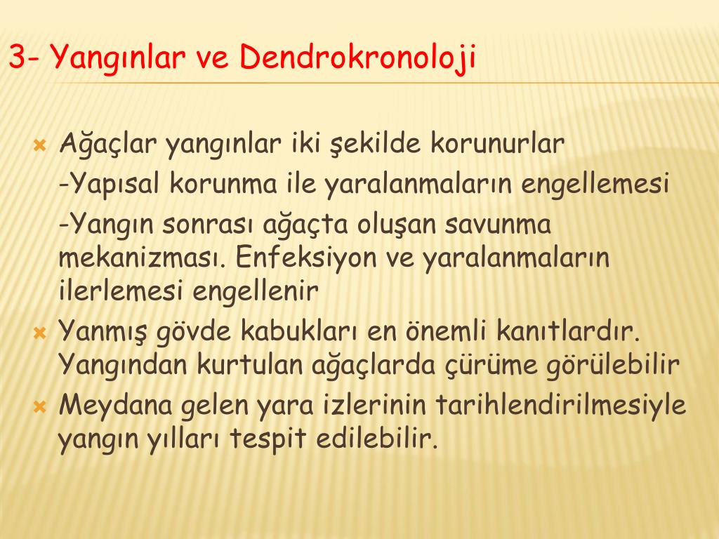 Ağaçlar yangınlar iki şekilde korunurlar -Yapısal korunma ile yaralanmaların engellemesi -Yangın sonrası ağaçta oluşan savunma mekanizması. Enfeksiyon ve yaralanmaların ilerlemesi engellenir Yanmış gövde kabukları en önemli kanıtlardır. Yangından kurtulan ağaçlarda çürüme görülebilir Meydana gelen yara izlerinin tarihlendirilmesiyle yangın yılları tespit edilebilir. 3- Yangınlar ve Dendrokronoloji