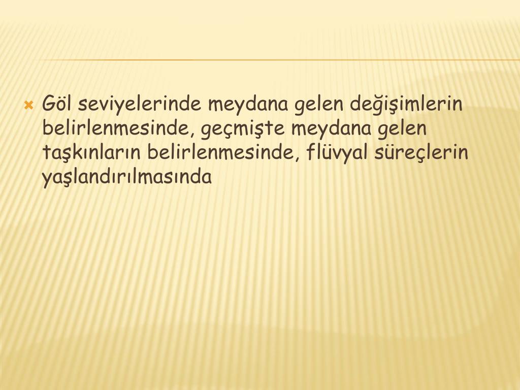 Göl seviyelerinde meydana gelen değişimlerin belirlenmesinde, geçmişte meydana gelen taşkınların belirlenmesinde, flüvyal süreçlerin yaşlandırılmasında