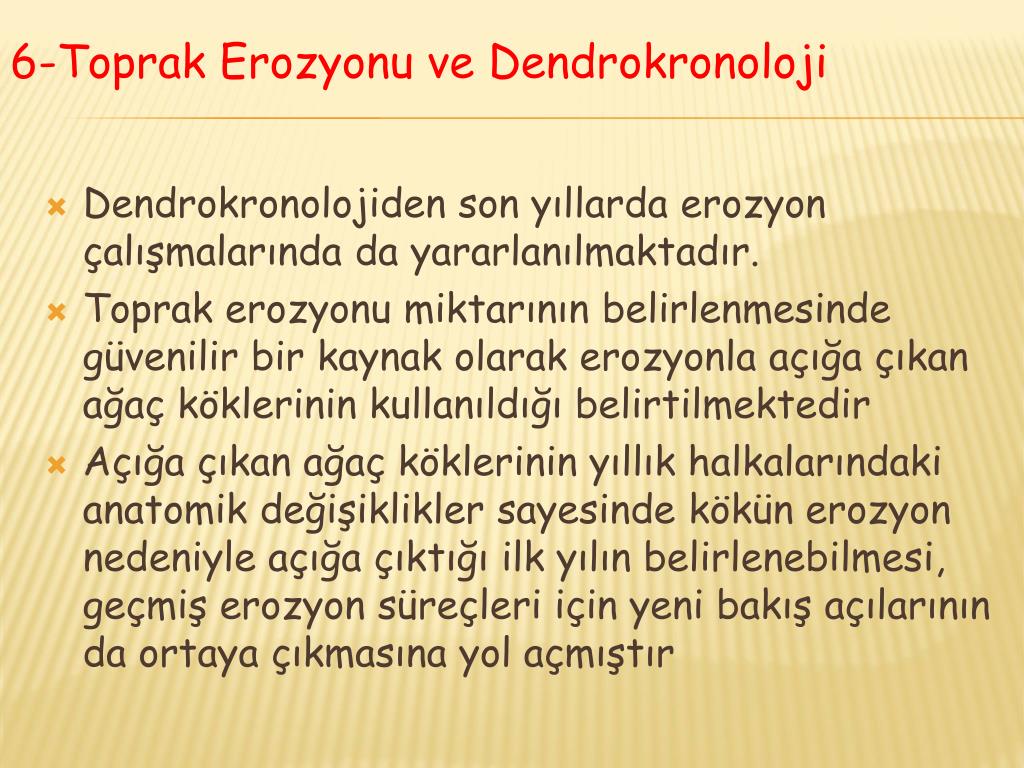 Dendrokronolojiden son yıllarda erozyon çalışmalarında da yararlanılmaktadır. Toprak erozyonu miktarının belirlenmesinde güvenilir bir kaynak olarak erozyonla açığa çıkan ağaç köklerinin kullanıldığı belirtilmektedir Açığa çıkan ağaç köklerinin yıllık halkalarındaki anatomik değişiklikler sayesinde kökün erozyon nedeniyle açığa çıktığı ilk yılın belirlenebilmesi, geçmiş erozyon süreçleri için yeni bakış açılarının da ortaya çıkmasına yol açmıştır 6-Toprak Erozyonu ve Dendrokronoloji