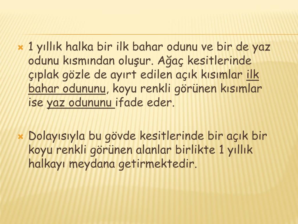 1 yıllık halka bir ilk bahar odunu ve bir de yaz odunu kısmından oluşur. Ağaç kesitlerinde çıplak gözle de ayırt edilen açık kısımlar ilk bahar odununu, koyu renkli görünen kısımlar ise yaz odununu ifade eder. Dolayısıyla bu gövde kesitlerinde bir açık bir koyu renkli görünen alanlar birlikte 1 yıllık halkayı meydana getirmektedir.