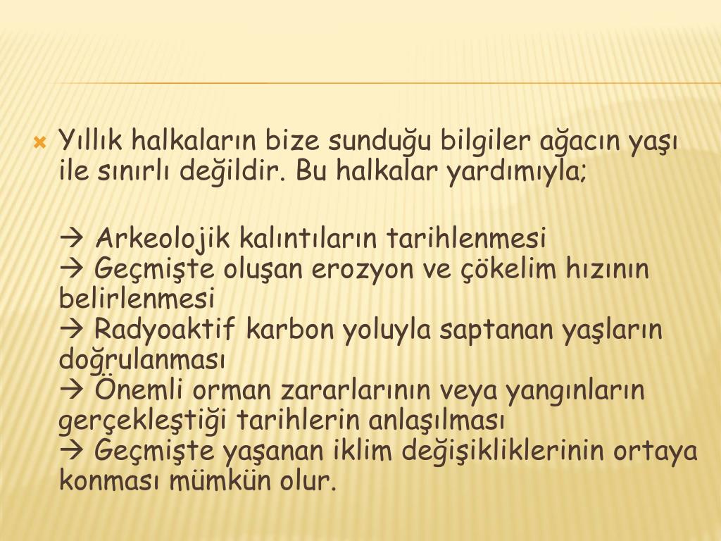 Yıllık halkaların bize sunduğu bilgiler ağacın yaşı ile sınırlı değildir. Bu halkalar yardımıyla; Arkeolojik kalıntıların tarihlenmesi Geçmişte oluşan erozyon ve çökelim hızının belirlenmesi Radyoaktif karbon yoluyla saptanan yaşların doğrulanması Önemli orman zararlarının veya yangınların gerçekleştiği tarihlerin anlaşılması Geçmişte yaşanan iklim değişikliklerinin ortaya konması mümkün olur.