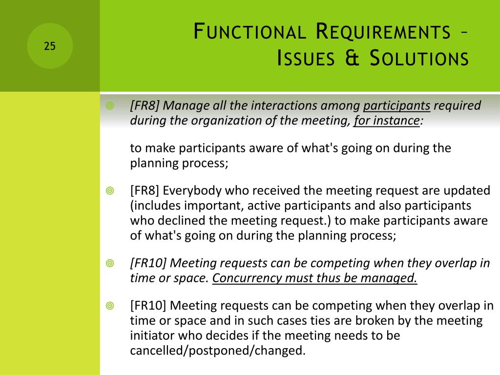 Functional Requirements – Issues & Solutions • [FR8] Manage all the interactions among participants required during the organization of the meeting, for instance: to make participants aware of what's going on during the planning process; • [FR8] Everybody who received the meeting request are updated (includes important, active participants and also participants who declined the meeting request.) to make participants aware of what's going on during the planning process; • [FR10] Meeting requests can be competing when they overlap in time or space. Concurrency must thus be managed. • [FR10]Meeting requests can be competing when they overlap in time or space and in such cases ties are broken by the meeting initiator who decides if the meeting needs to be cancelled/postponed/changed.