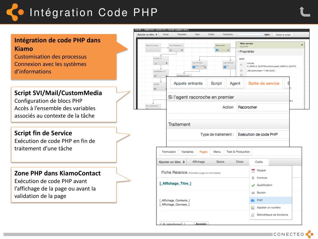 Intégration Code PHP Intégration de code PHP dans Kiamo Customisation des processus Connexion avec les systèmes d’informations Script SVI/Mail/CustomMedia Configuration de blocs PHP Accès à l’ensemble des variables associés au contexte de la tâche Script fin de Service Exécution de code PHP en fin de traitement d’une tâche Zone PHP dans KiamoContact Exécution de code PHP avant l’affichage de la page ou avant la validation de la page
