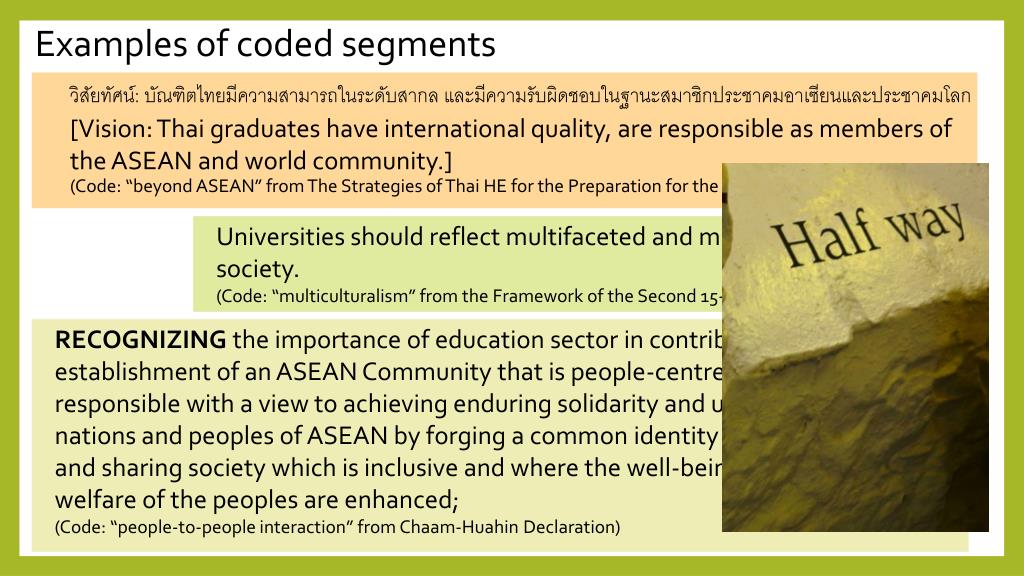 Examples of coded segments • วิสัยทัศน์: บัณฑิตไทยมีความสามารถในระดับสากล และมีความรับผิดชอบในฐานะสมาชิกประชาคมอาเซียนและประชาคมโลก [Vision: Thai graduates have international quality, are responsible as members of the ASEAN and world community.] • (Code: “beyond ASEAN” from The Strategies of Thai HE for the Preparation for the ASEAN Community in 2015 ) Universities should reflect multifaceted and multicultural nature of a society. (Code: “multiculturalism” from the Framework of the Second 15-year Long Range Plan) RECOGNIZING the importance of education sector in contributing to the establishment of an ASEAN Community that is people-centred and socially responsible with a view to achieving enduring solidarity and unity among the nations and peoples of ASEAN by forging a common identity and building a caring and sharing society which is inclusive and where the well-being, livelihood, and welfare of the peoples are enhanced; (Code: “people-to-people interaction” from Chaam-Huahin Declaration)