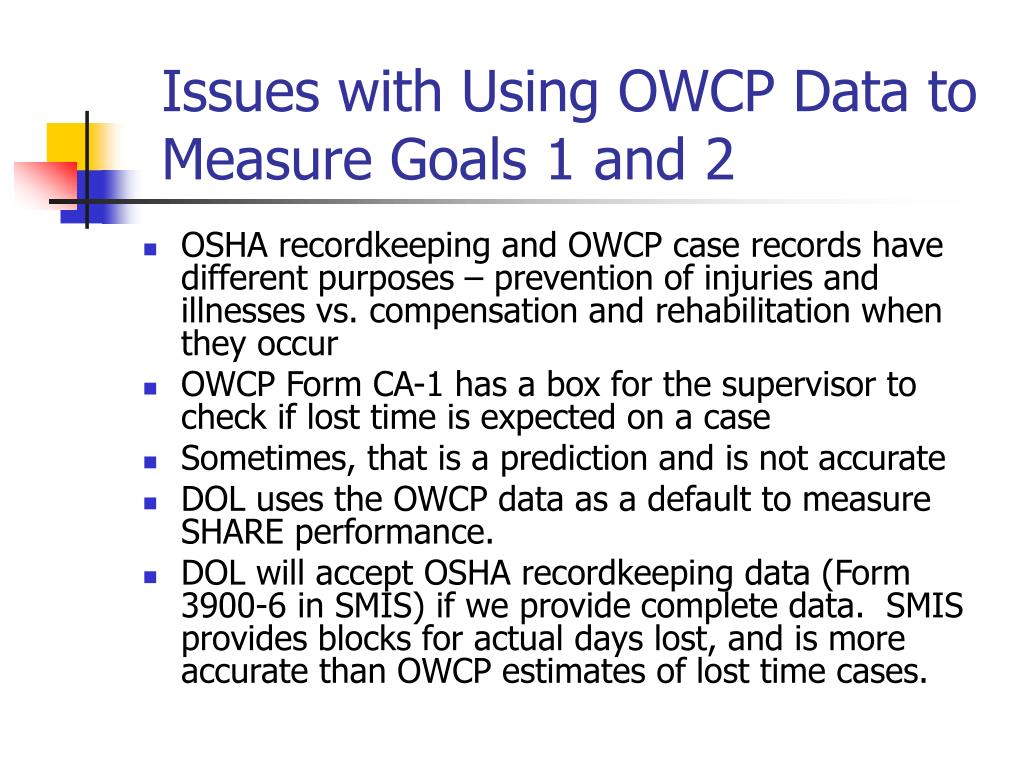 Issues with Using OWCP Data to Measure Goals 1 and 2 • OSHA recordkeeping and OWCP case records have different purposes – prevention of injuries and illnesses vs. compensation and rehabilitation when they occur • OWCP Form CA-1 has a box for the supervisor to check if lost time is expected on a case • Sometimes, that is a prediction and is not accurate • DOL uses the OWCP data as a default to measure SHARE performance. • DOL will accept OSHA recordkeeping data (Form 3900-6 in SMIS) if we provide complete data. SMIS provides blocks for actual days lost, and is more accurate than OWCP estimates of lost time cases.