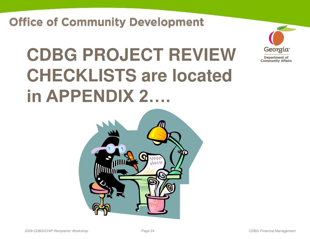 CDBG PROJECT REVIEW CHECKLISTS are located in APPENDIX 2…. CDBG Financial Management