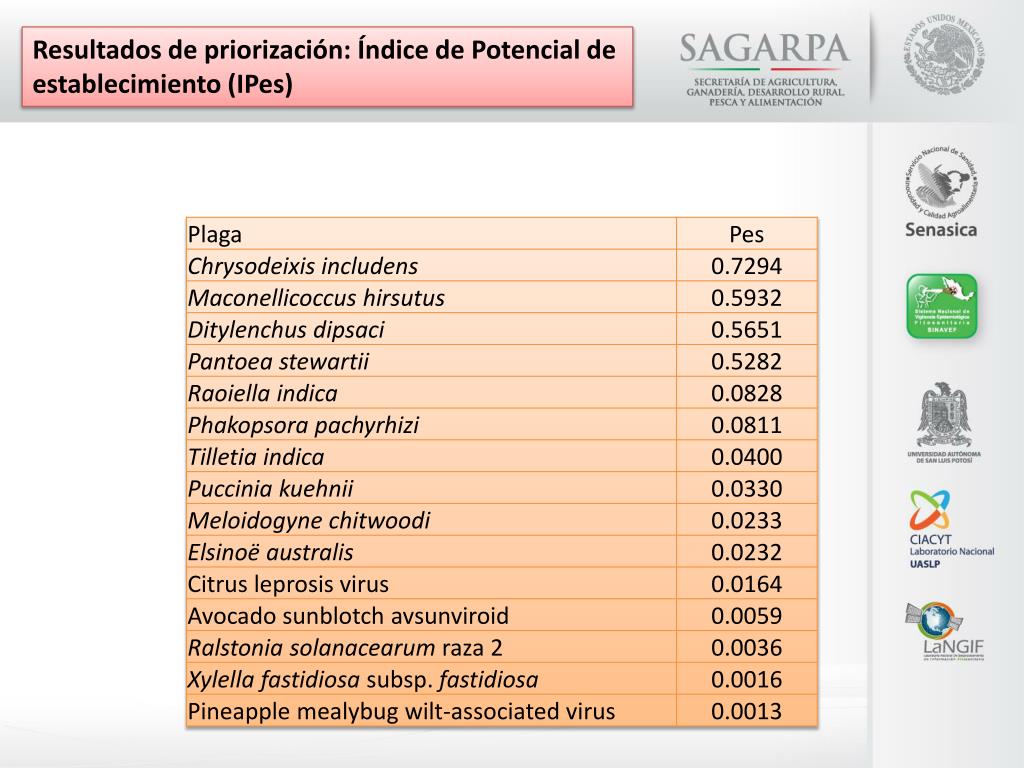 Como parte del uso de la metodología de Priorización se realizaron las siguientes sugerencias sobre las plagas que se indentificaron con mayor riesgo de entrada y establecimiento al territorio mexicano