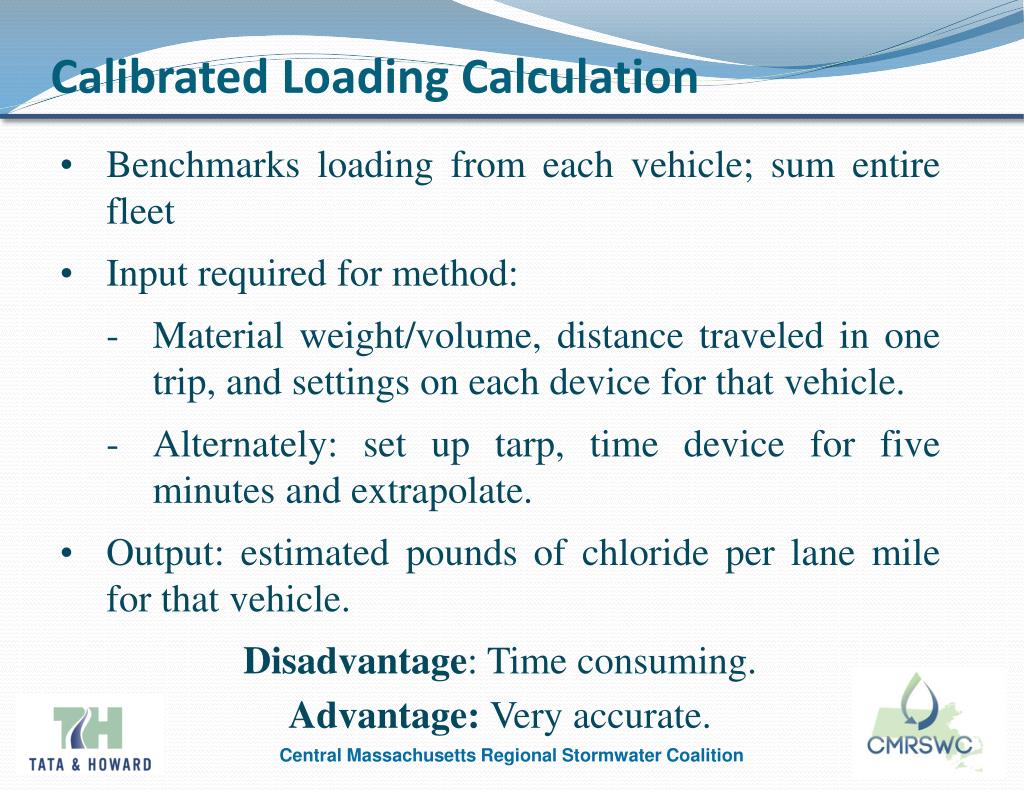 Calibrated Loading Calculation Choose a target delivery rate. Review and document settings on each application device on vehicle. Adjust settings to reduce delivery toward target. Test reduced delivery rate during storm event, ensure that public safety is not impacted. Continue to recalibrate and make additional reductions on an iterative basis.