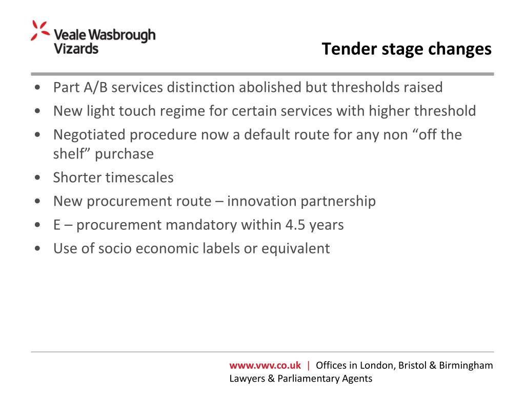 Tender stage changes • Part A/B services distinction abolished but thresholds raised • New light touch regime for certain services with higher threshold • Negotiated procedure now a default route for any non “off the shelf” purchase • Shorter timescales • New procurement route – innovation partnership • E – procurement mandatory within 4.5 years • Use of socio economic labels or equivalent