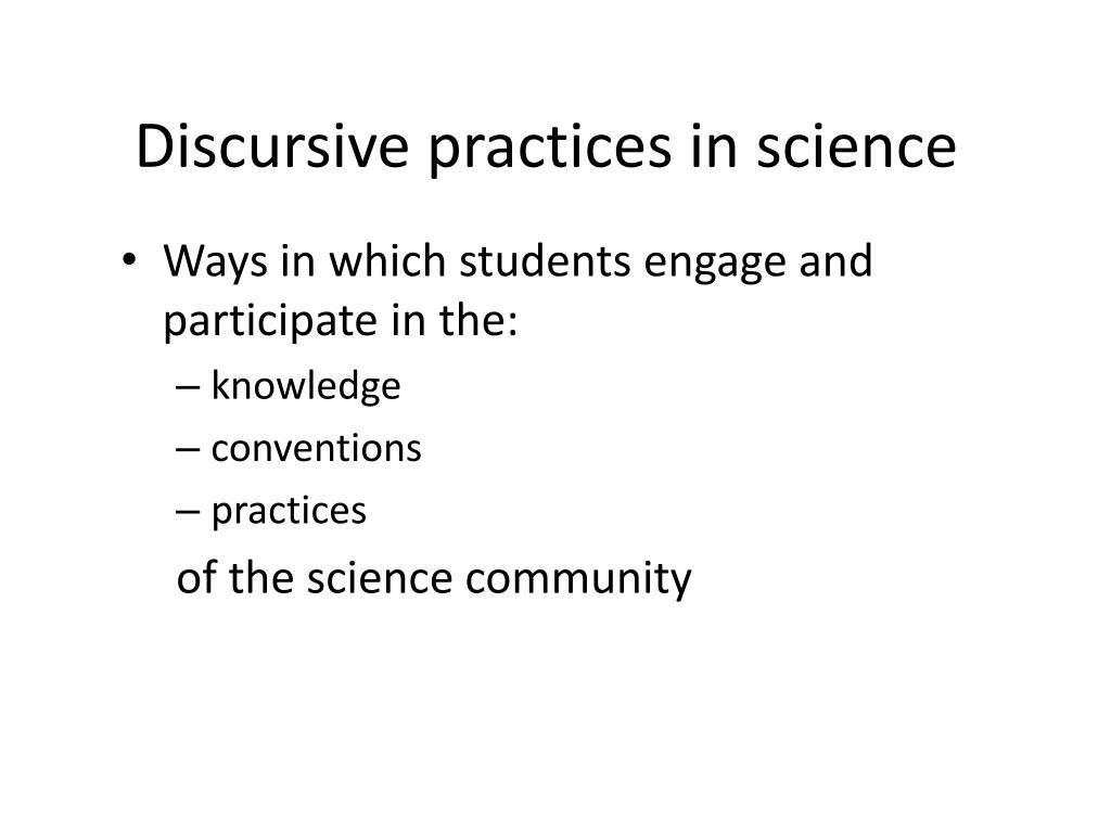 Discursive practices in science • Ways in which students engage and participate in the: • knowledge • conventions • practices of the science community