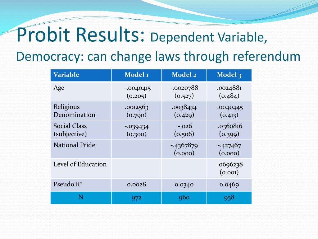 Data • Data comes from the World Values Survey 2001 • Dependent Variable: Democracy: can change laws through referendums • Independent Variables: • Age • Religious Denomination • Social class • National Pride • Level of education