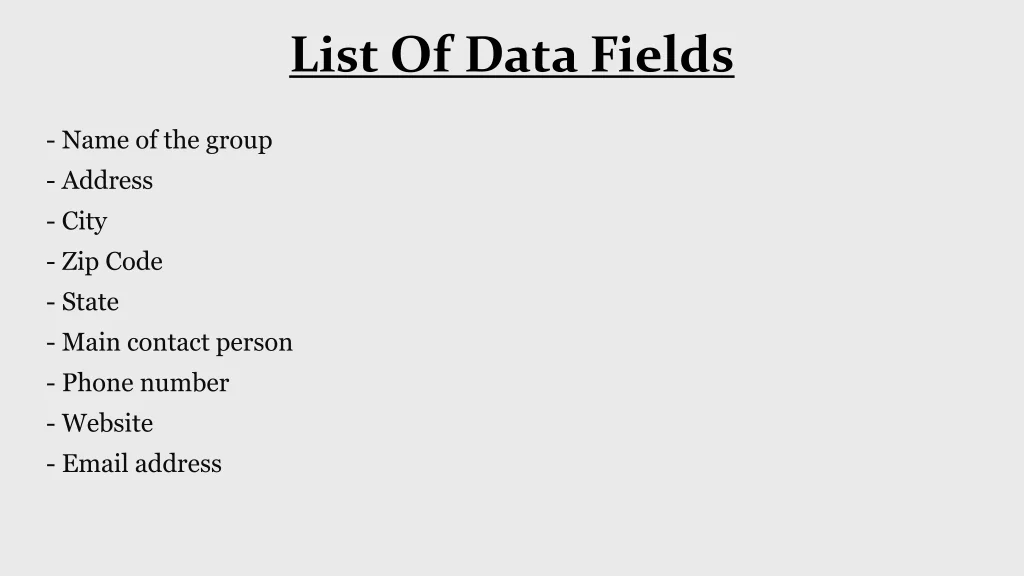 List Of Data Fields - Name of the group - Address - City - Zip Code - State - Main contact person - Phone number - Website - Email address