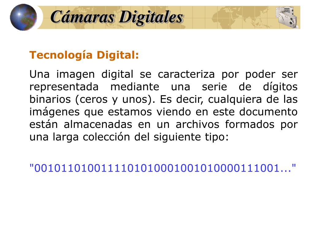 Cámaras Digitales Tecnología Digital: Una imagen digital se caracteriza por poder ser representada mediante una serie de dígitos binarios (ceros y unos). Es decir, cualquiera de las imágenes que estamos viendo en este documento están almacenadas en un archivos formados por una larga colección del siguiente tipo: "0010110100111101010001001010000111001..."