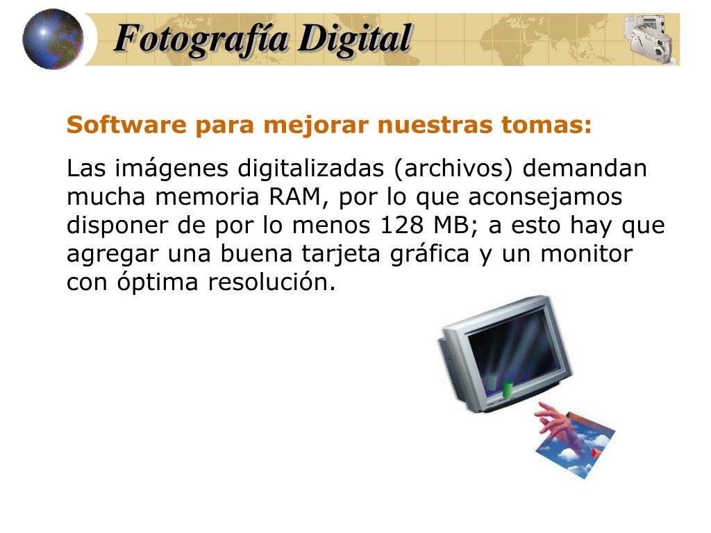 Fotografía Digital Software para mejorar nuestras tomas: Las imágenes digitalizadas (archivos) demandan mucha memoria RAM, por lo que aconsejamos disponer de por lo menos 128 MB; a esto hay que agregar una buena tarjeta gráfica y un monitor con óptima resolución.