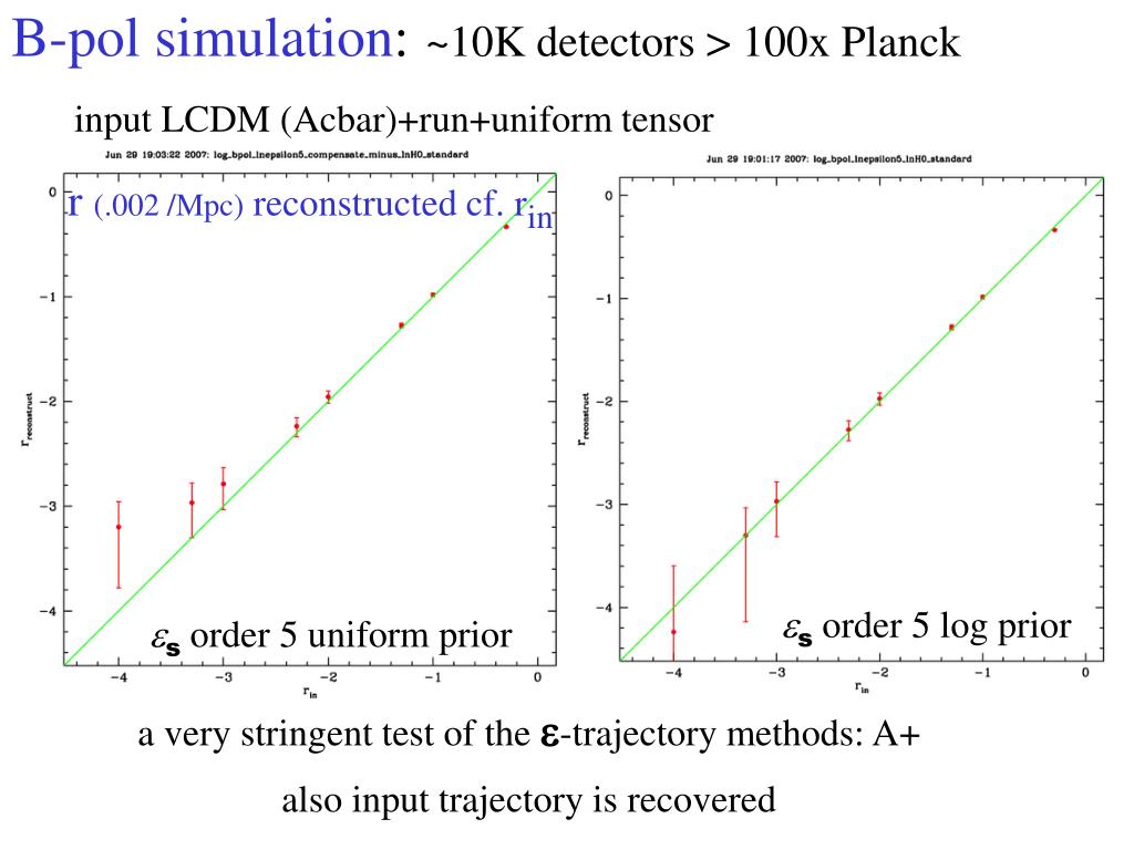 B-pol simulation:~10K detectors > 100x Planck input LCDM (Acbar)+run+uniform tensor r (.002 /Mpc) reconstructed cf. rin esorder 5 log prior esorder 5 uniform prior a very stringent test of the e-trajectory methods: A+ also input trajectory is recovered