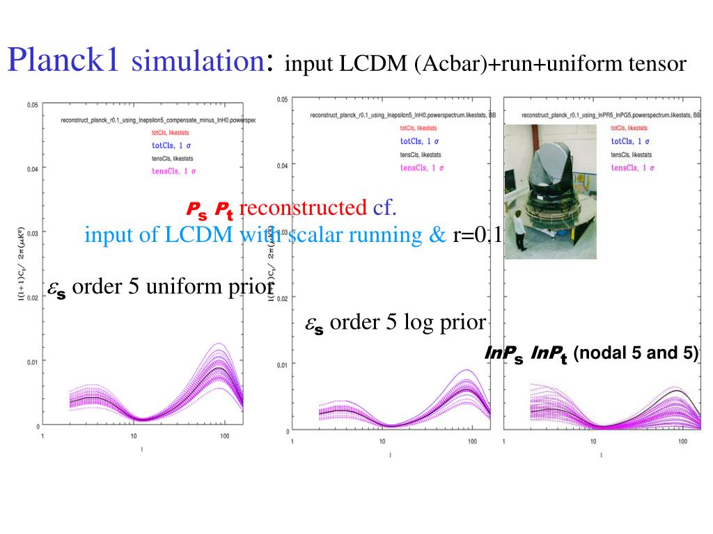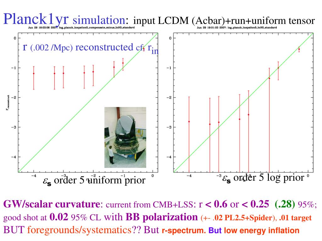 Planck1yr simulation:input LCDM (Acbar)+run+uniform tensor r (.002 /Mpc) reconstructed cf. rin esorder 5 log prior esorder 5 uniform prior GW/scalar curvature: current from CMB+LSS: r < 0.6 or < 0.25(.28)95%;good shot at0.0295% CL with BB polarization (+- .02 PL2.5+Spider), .01 target BUT foregrounds/systematics?? But r-spectrum. But low energy inflation