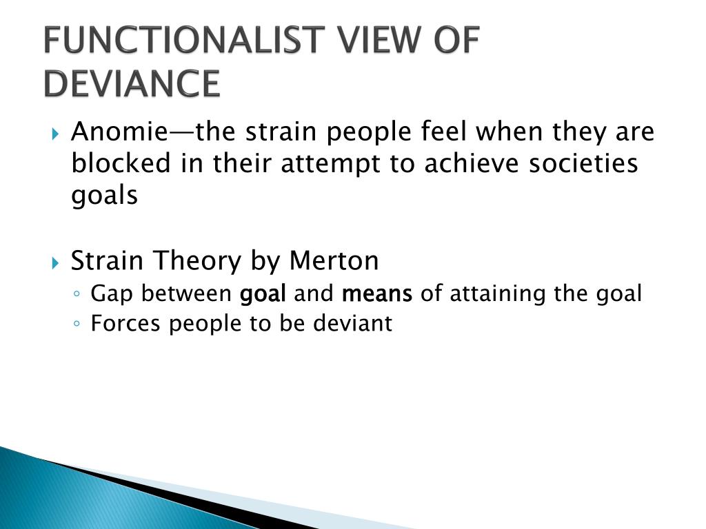 FUNCTIONALIST VIEW OF DEVIANCE • Anomie—the strain people feel when they are blocked in their attempt to achieve societies goals • Strain Theory by Merton • Gap between goal and means of attaining the goal • Forces people to be deviant