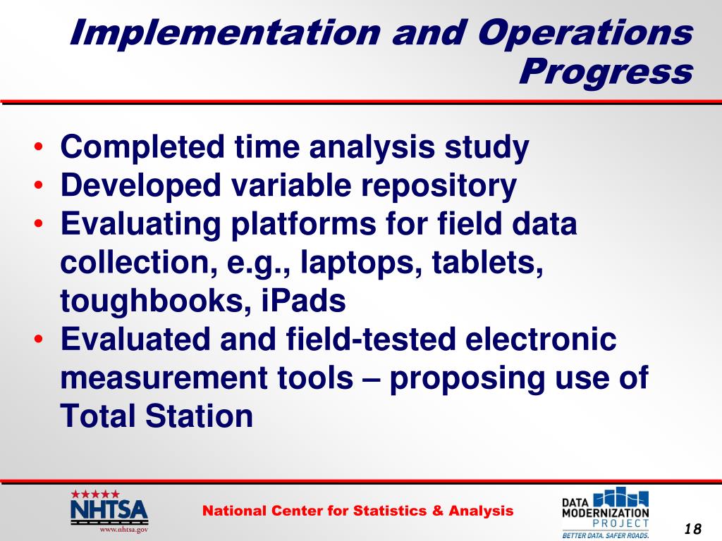 Implementation and Operations Progress • Completed time analysis study • Developed variable repository • Evaluating platforms for field data collection, e.g., laptops, tablets, toughbooks, iPads • Evaluated and field-tested electronic measurement tools – proposing use of Total Station