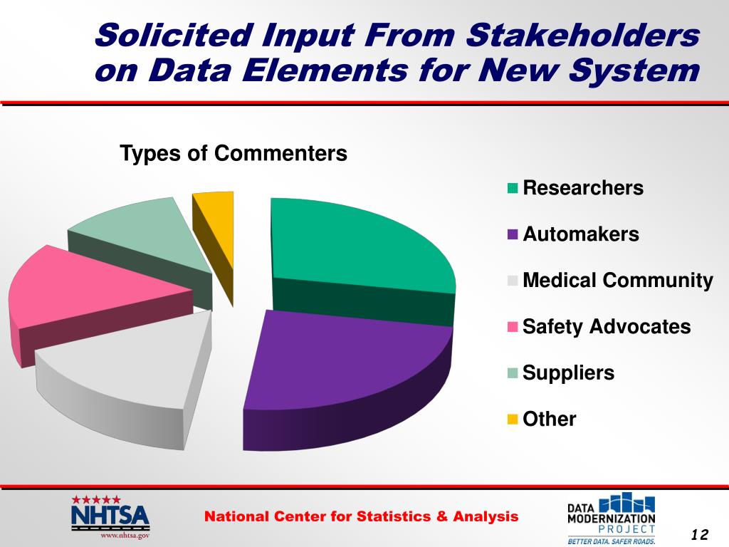 Comments From Stakeholders on Data Elements for New System • Sample – (expand size, focus on higher severity crashes, newer and older vehicles, improve weights) • Scene (scaled diagrams, physical evidence, environmental items, terrain) • Vehicle (detailed event data recorder data, velocities, photos) • Other (more data in public file, include other vehicles and peds; continue crashworthiness data collection; collect more avoidance data)