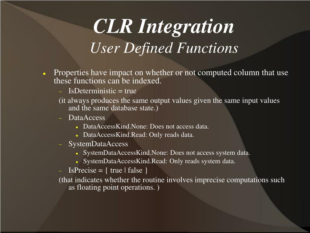 CLR IntegrationUser Defined Functions • Properties have impact on whether or not computed column that use these functions can be indexed. • IsDeterministic = true (it always produces the same output values given the same input values and the same database state.) • DataAccess • DataAccessKind.None: Does not access data. • DataAccessKind.Read: Only reads data. • SystemDataAccess • SystemDataAccessKind.None: Does not access system data. • SystemDataAccessKind.Read: Only reads system data. • IsPrecise = { true | false } (that indicates whether the routine involves imprecise computations such as floating point operations. )