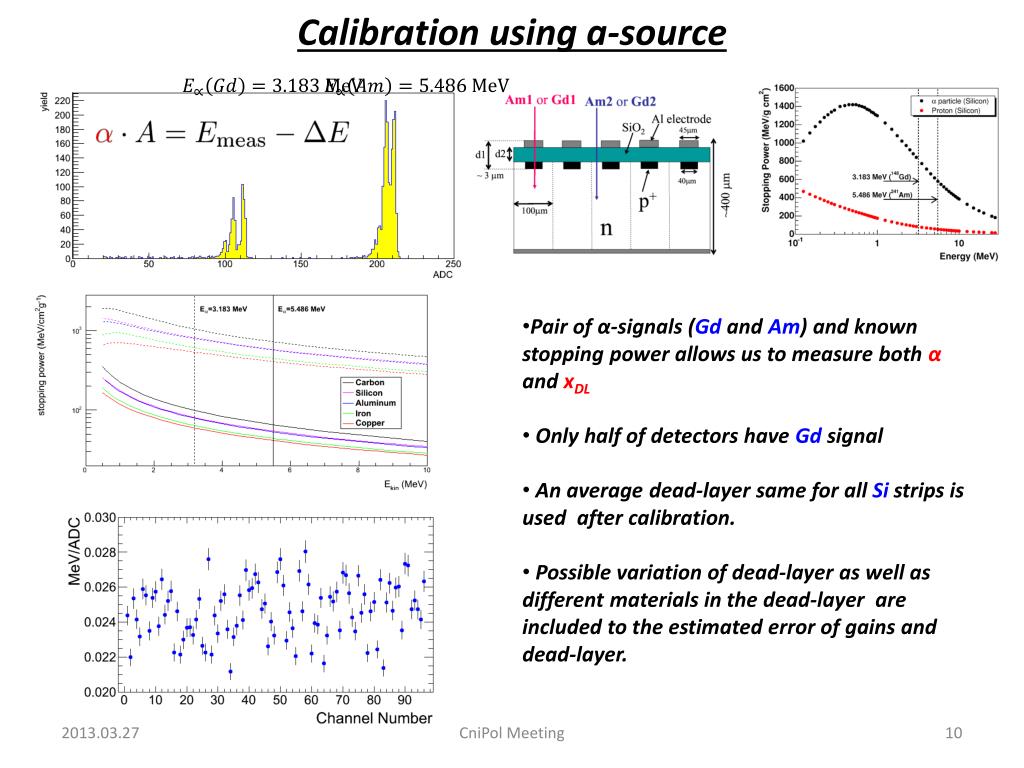 Calibration using a-source • Pair of α-signals (Gd and Am) and known stopping power allows us to measure both α and xDL • Only half of detectors have Gd signal • An average dead-layer same for all Si strips is used after calibration. • Possible variation of dead-layer as well as different materials in the dead-layer are included to the estimated error of gains and dead-layer. CniPol Meeting