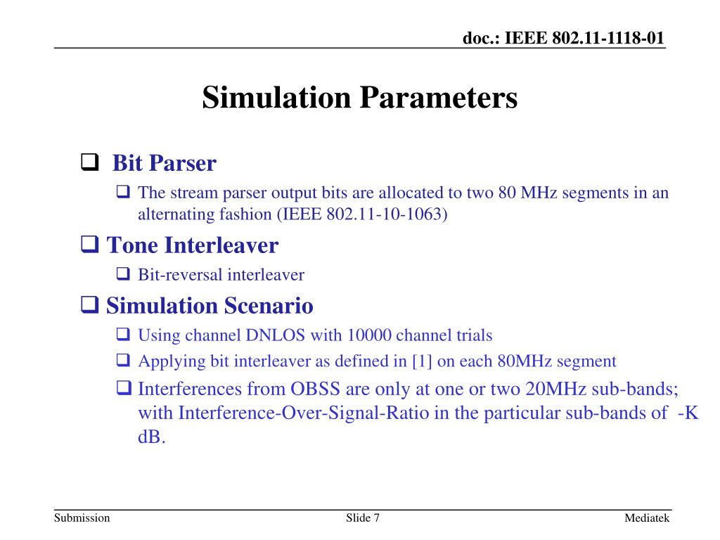 Simulation Parameters Mediatek • Bit Parser • The stream parser output bits are allocated to two 80 MHz segments in an alternating fashion (IEEE 802.11-10-1063) • Tone Interleaver • Bit-reversal interleaver • Simulation Scenario • Using channel DNLOS with 10000 channel trials • Applying bit interleaver as defined in [1] on each 80MHz segment • Interferences from OBSS are only at one or two 20MHz sub-bands; with Interference-Over-Signal-Ratio in the particular sub-bands of -K dB.