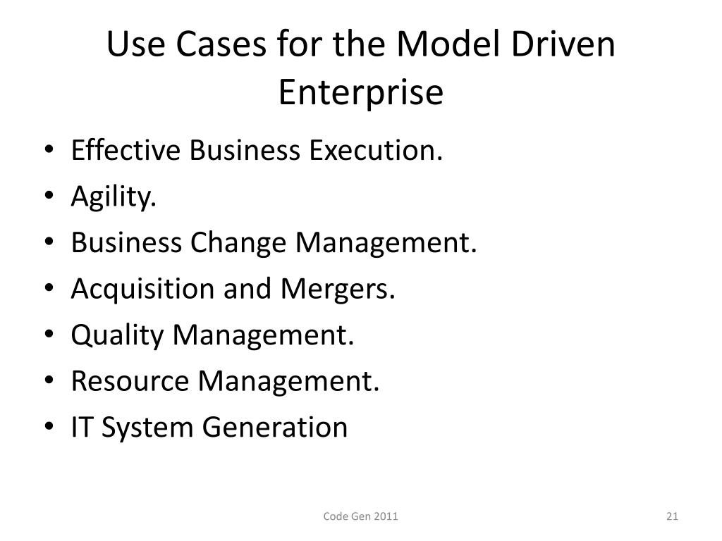 Use Cases for the Model Driven Enterprise • Effective Business Execution. • Agility. • Business Change Management. • Acquisition and Mergers. • Quality Management. • Resource Management. • IT System Generation Code Gen 2011